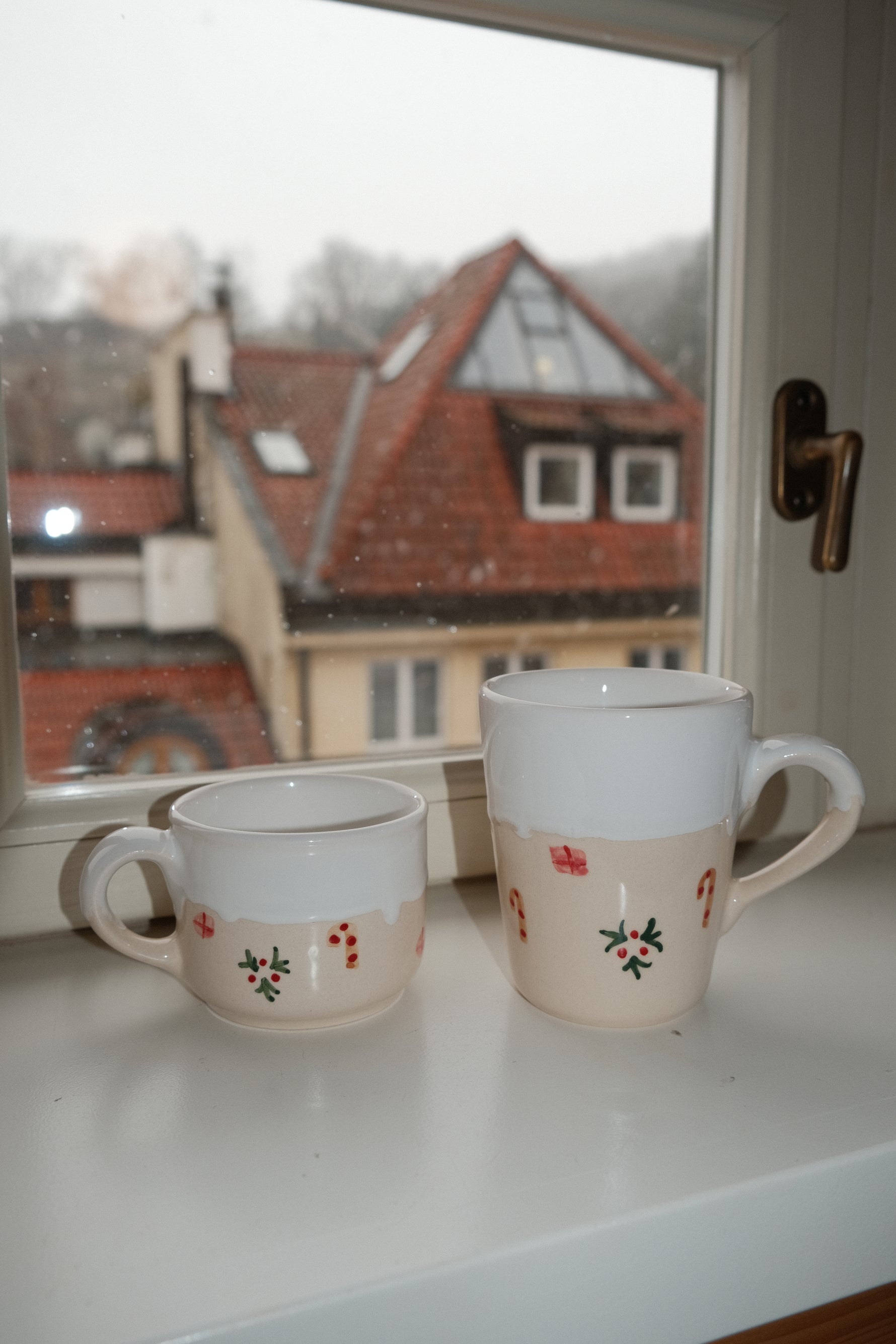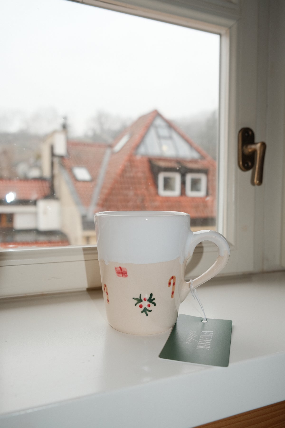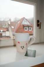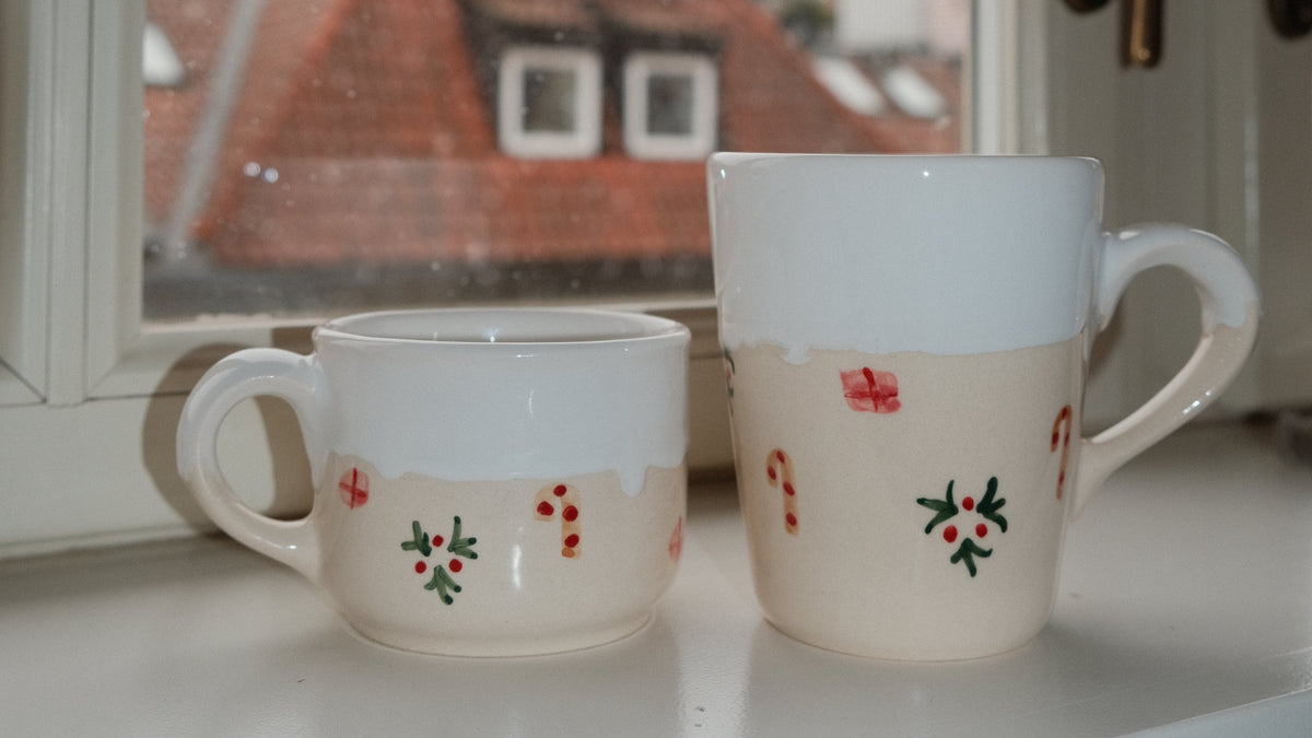 Vánoční hrnek je zdobený motivy dárků, cukrových hůlek a jmelí. Je pokrytý jemně lesklou bílou glazurou, která má evokovat lavinu sněhu ❄️