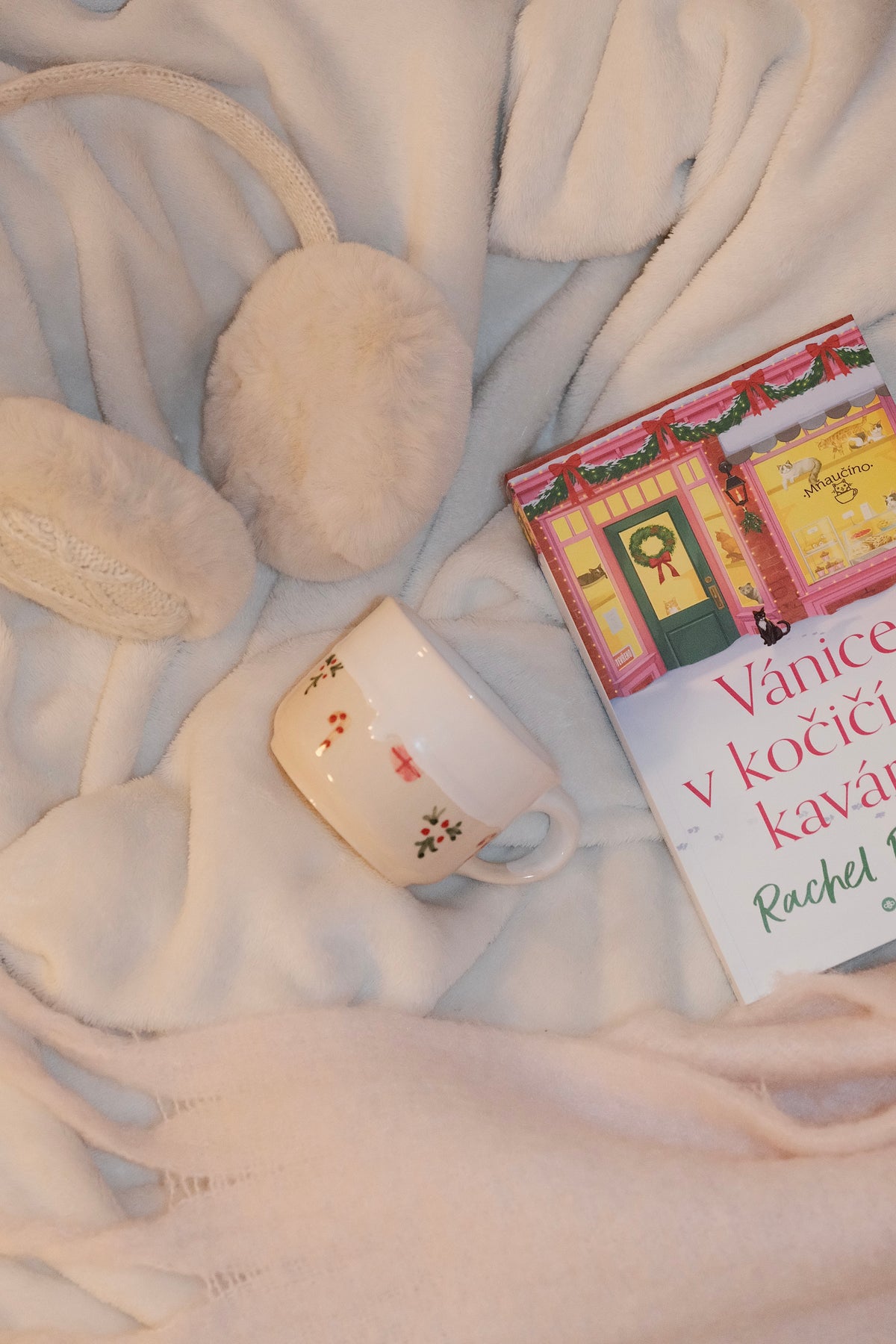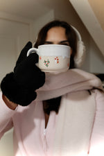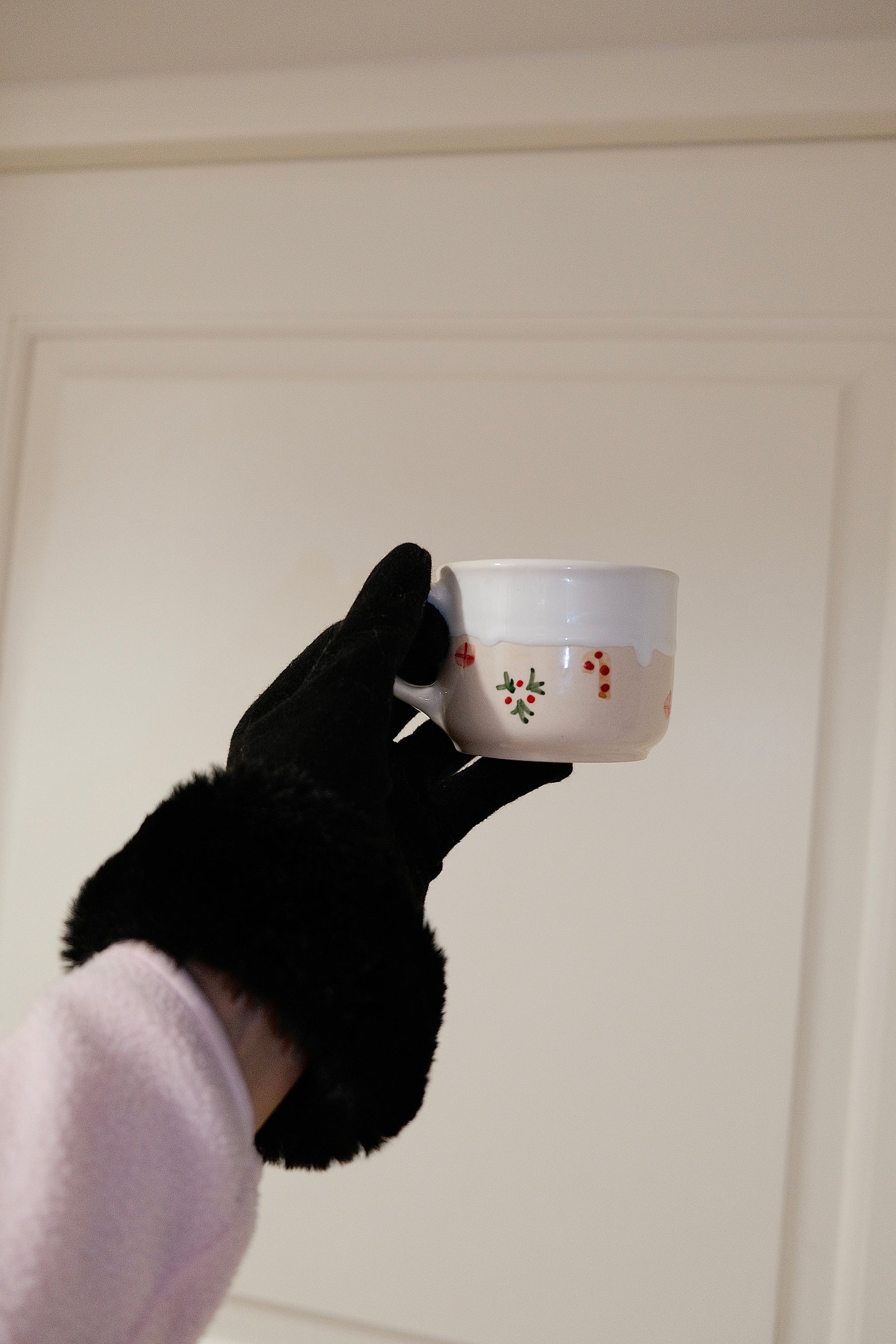 Vánoční hrnek je zdobený motivy dárků, cukrových hůlek a jmelí. Je pokrytý jemně lesklou bílou glazurou, která má evokovat lavinu sněhu ❄️